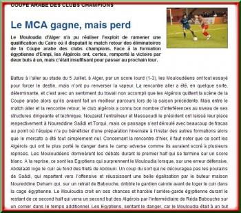 ascendant et ratèrent l’occasion de niveler la marque sur une bévue deBouacida. Mais le défenseur mouloudéen rectifiera le tir et dégagera le cuir sur la ligne (25’). Daham, sans doute l’homme du match, s’estmontré très menaçant et inquiète une autre fois le gardien sur uncentre de Bougueche qui fut sauvé in extremis par un défenseur (35’).