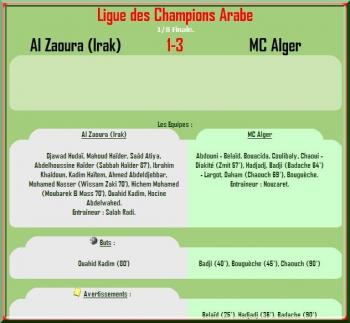 Le MC Alger s'est qualifié, hier, aux quarts de finale de la Ligue arabe des champions à la faveur de sa victoire sur Al Zawra sur le score de 1 à 3 au match retour disputé hier à Amman (Jordanie) devant une assistance faible. La bande a bien confirmé sa supériorité sur son adversaire et, du coup, la victoire du match aller (3-0), obtenue il y a quinze jours à Alger. Après un round d'observation, le Mouloudia a pris les choses en main en se créant plusieurs occasion nettes de scorer, notamment par Daham et Badji. Ou encore par Bouacida qui voyait sa reprise de la tête consécutivement à un coup franc de Badji passer légèrement à côté. Et ce n'est donc que logique que le représentant algérien trouvera le chemin des filets. D'abord par le meneur de jeu Fayçal Badji qui, à hauteur des 18 mètres, reprend magistralement de la tête un centre parfait de Bougache et trompe le gardien d'Al Zaoura. Dans l'ultime minute de la fin de la première période, le passeur Bougache se transforme en buteur et parvient à doubler la mise à l'issue d'une belle action collective. Un une-deux avec Daham, l'ancien Blidéen élimine un défenseur et d'un tir du pied droit ne laissera aucune chance au gardien Udee. La bande à Salah Radhi s'est créé quelques occasions qui auraient pu faire mouche n'était la vigilance de Abdouni qui veillait au grain, notamment les deux têtes de Haïder Mahmoud où le portier mouloudéen s'est interposé avec brio pour dévier le cuir en corner (36e et 42e). Au retour des vestiaires, le jeu baissa d'intensité, notamment du côté du MCA, qui semblait satisfait du résultat. Et pourtant, Daham d'un coup franc bien botté (51e) puis Bougache de la tête (60e) faillirent aggraver la marque. L'occasion la plus nette aura été cette percée de Belaïd qui fut descendu à l'intérieur de la surface de réparation, mais l'arbitre ne bronche pas (68e). Dans les dix dernières minutes, l'équipe d'Al Zawra accentue la pression dans l'espoir de réduire la marque. Elle parviendra toutefois à trouver le chemin des filets par l'intermédiaire de Omar Kadhem qui d'un tir à ras de terre, consécutivement à un joli travail collectif, trompera la vigilance du gardien Abdouni (80e). Haider Abdelamine ratera, deux minutes plus tard, l'occasion de niveler la marque en voyant son tir passer légèrement à côté. Dans l'ultime minute, le MC Alger parviendra à sceller définitivement le sort des Irakiens sur un coup franc bien travaillé par Braham Chaouch qui finira en pleine lucarne. Ainsi, le Mouloudia est qualifié aux quarts de finale, dont le tirage au sort aura lieu les 28 et 29 novembre.