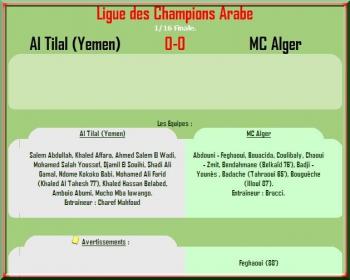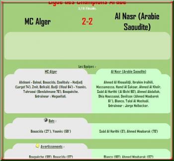 Stade du "5 Juillet 1962" Arbitres: Issam Abdelfettah, Nacer Hamada, Sobhi Rached (Egypte) - Buts : Bouacida 27', Younès 58' MCA, Saâd Harithi 7', Ahmed Mebarek 69' Al Nasr Saoudi (Tahraoui rate un penalty à la 35' pour le MCA) - Avertissements : Bouguèche 59’, Bouacida 87' MCA, Dhia Houssaoui 14’, Blanco 61’, Ahmed Mebarek 81' Al Nasr Saoudi.