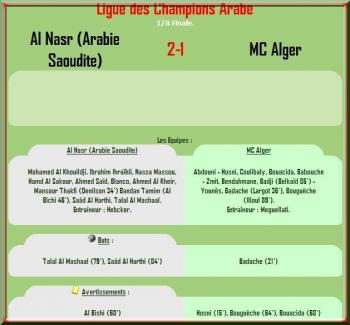 à Riyad Stade du "Prince Fayçal" Al-Nasr Saoudi (Arabie Saoudite-MC Alger 2-1 Talal Mashâal 79', Saâd Al-Harrithi 87' Al Nasr Saoudi Badache 21' MCA - Arbitres: Abdellah El Hllali, Abdellah El Amoudi, Salem Batachi (Oman) - Avertissements : Al Bishi 60' Al Nasr Hosni 15', Bouguèche 64', Bouacida 68' MCA