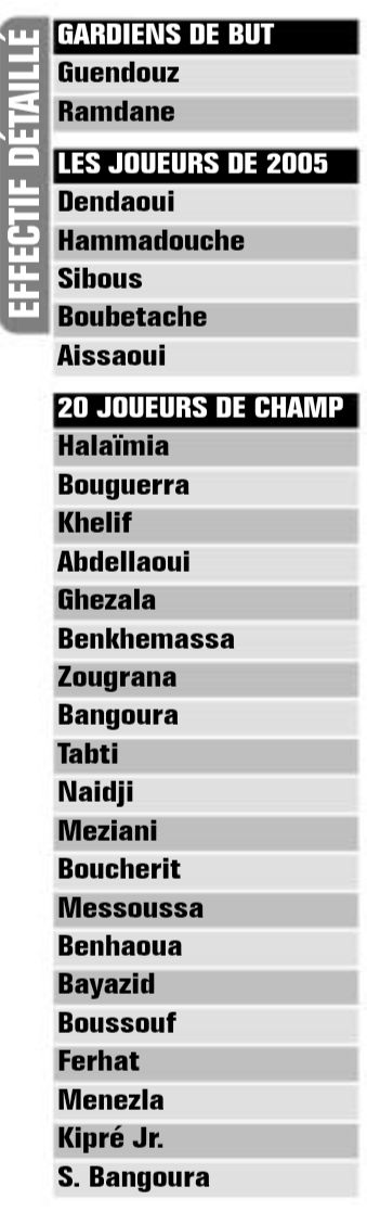 Zunon Kipre Tiagouri Emmanuel Junior "Kipre Jr", Boucherit Mehdi, Naidji Zakaria, Bayazid Sofiane, Bangoura Mohamed Saliou, Messoussa Amine Abdel Rahmane, Benhaoua Oussama, Meziani Tayeb, Ferhat Zinedine (SCO Angers, Ligue 1 France), Hamadouche Yacine (2005)