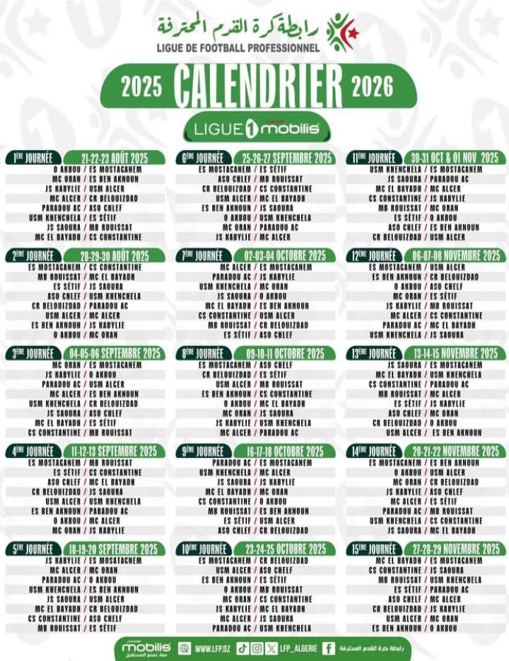 Vendredi 12.9.2025 à Béjaïa Stade "L'Unité Maghrébine" Olympique Akbou-MCA 0-1 Halaimia 7'- Arbitres : Dahar, Rzouga, Kessar - VAR : Harkat, Ghezlane - Avertissements : Amriche 29', Addadi 45'+1 O.Akbou Kipre Jr 20', Tabti 48', Guendouz 56' MCA (Absents Khelif, Menezla et Bangoura Mohamed Saliou blessés Ferhat et Boussouf pas encore prêts, Bangoura Alhassane en Guinée)
