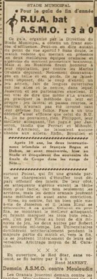 Dimanche 30.12.1945 au Municipal Tournoi du Nouvel An RSA-MCA 2-0 (Abdelaoui absent remplacé par Khabatou) / RUA-AS Marine d'Oran 3-0