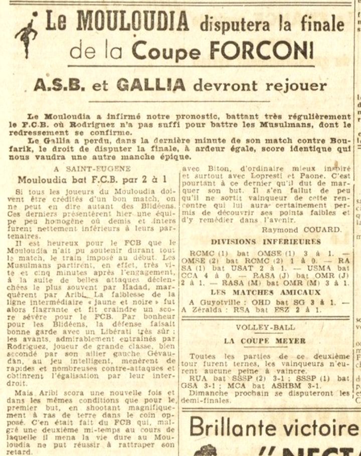 Dimanche 13.1.1946 au Stade de Saint-Eugène Coupe Forconi 1/2 Finale MCA-FC Blida 2-1 (FCB Qualifié sur Tapis vert)