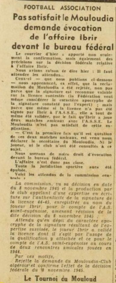 11.2.1946 Le Mouloudia a pris connaissance de la décision de la Fédération qui ne réfute pas l'expertise de Mr G.Valet mais prend en considération les 2 matches amicaux joués par ibrir avec l'ASSE en 1944, donc Licence B validée. De ce fait la FFF a rejetée la Réclamation du MCA Le Mouloudia estime que le fait nouveau de ces 2 matches amicaux n'est pas acceptable du moment que ni le Club ni le joueur n'ont été consultés pour se défendre et demande à ce que le dossier Ibrir Abderahmane soit transmis au Bureau Fédéral.