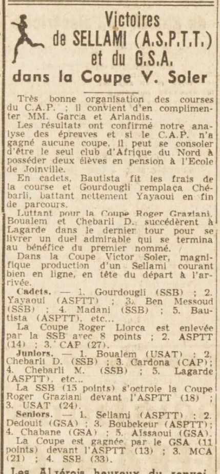 10.3.1946 MCA Cross participe au Cross du C.A.P sur le parcours de Plateau Saulière d'Alger termine 3ème au classement par équipes Seniors avec Chekroune 6ème, Brahimi 7ème, Akloul 8ème, Boulassel 10ème, Bekkat Mohamed 12ème