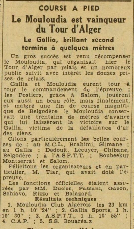 24.3.1946 MCA Cross organise et remporte le Tour d'Alger des Relais (11 Relais sur 23 Kms) avec Boulassel, Ali Chérif, Akloul, Brahimi, Slimane, Habib, Madani, Hammani Abdelkader, Bekkat Mohamed, Nessira, Kermia Mustapha, Mghezzi Chaâ Tayeb dit Tayeb