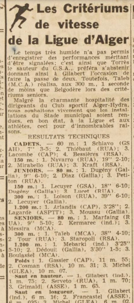 14.4.1946 MCA Cross participe au Critérium d'Alger Mghezzi Chaâ Tayeb dit Tayeb vainqueur du 300m, bon comportement de Boulassel et Nessira