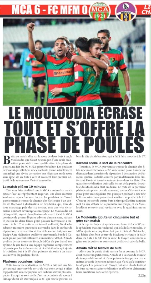 Samedi 17.3.2018 au Stade du "5 juillet" 2ème Tour préliminaire Ligue des Champions Africaine Retour MCA-MFM.FC (Nigéria) 6-0