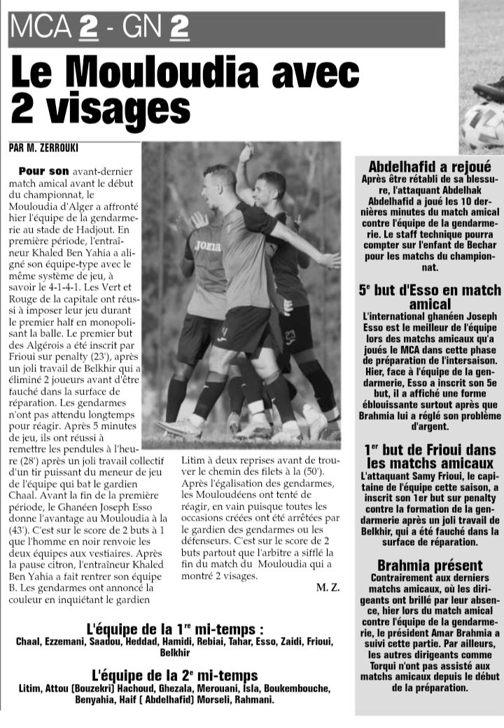 Mercredi 20.10.2021 àu Stade Annexe"Brahim Hadjout" Amical MCA-Commandement de la Gendarmerie Nationale 2-2