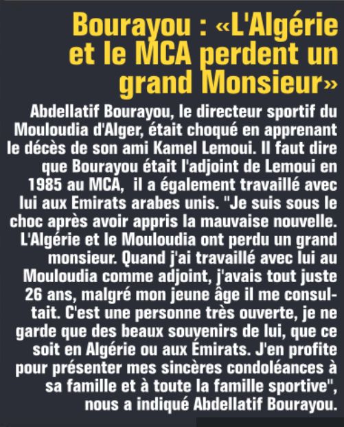 Lundi 3.1.2022 Décès à Paris de Lemoui Kamel l'ancien Capitaine 1963-1965 et Entraîneur du Mouloudia Champion d'Algérie 1977-1978, DTS/Entraîneur Champion de la Régionale Centre et Accession en Nationale I avec 0 Défaite en 1985-1986 et DTS en 1995-1996