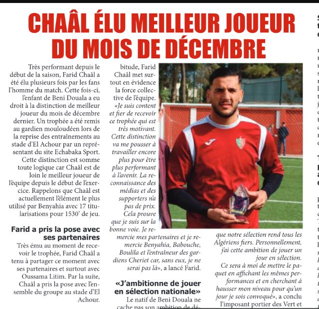 Chaâl Farid meilleur Joueur du Mois de Décembre