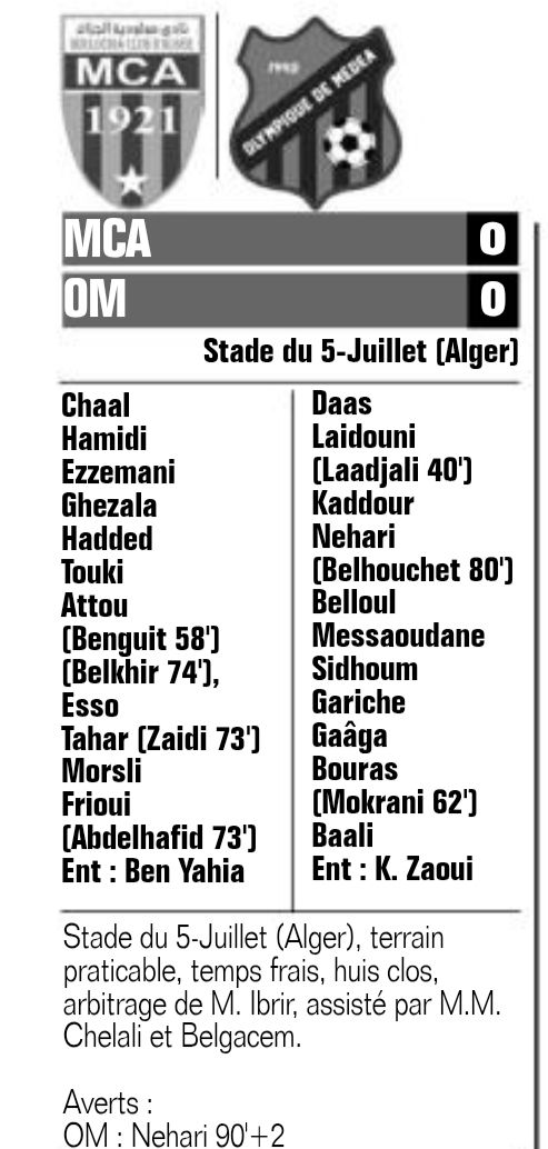 Vendredi 1.4.2022 au Stade du "5 juillet 1962" (veille de Ramadhan) à Huis Clos MCA-Olympique de Médéa 0-0
