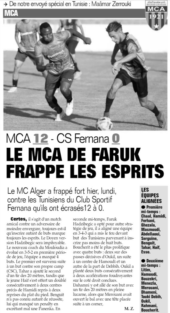 Lundi 1.8.2022 à Ain Draham (Tunisie) Amical CS Fernana (Division 5 Tunisie)- MCA 0-12 Buts X (contre son camp), Tahar, Haif 2 fois, Merouani, Oukil 2 fois, Boucherit Mehdi 4 fois, Dahamni (Benguit a raté un penalty pour le MCA en 1ère mi-temps, signe au Raja Casablanca après ce match)