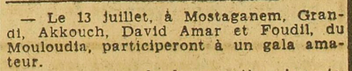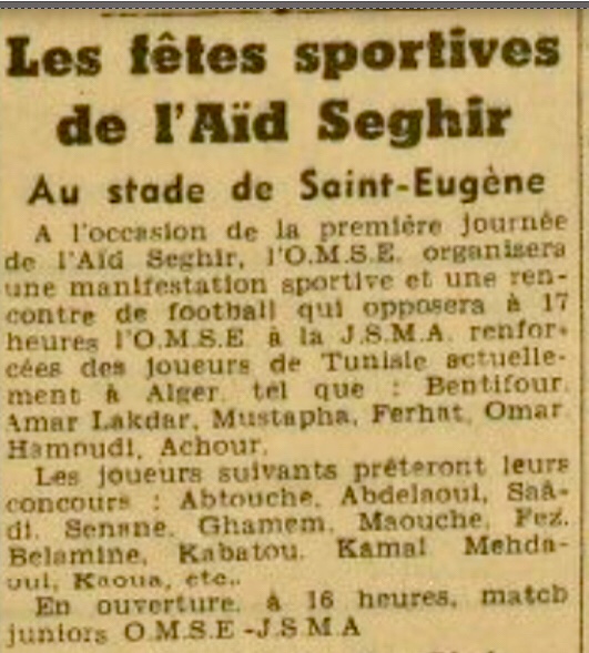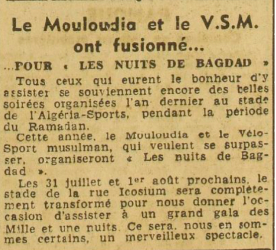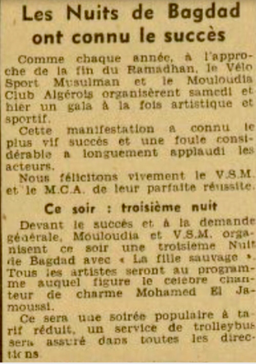 Du 22 au 24.7.1949 "Nuits de Baghdad" veille de l'Aïd El Fitr, soirée culturelle et artistique organisée par le VSM (Vélo Sport Musulman) et le MCA (Commission des fêtes) avec une pièce théâtrale et de la musique - spécial invité Mohamed El Jamoussi