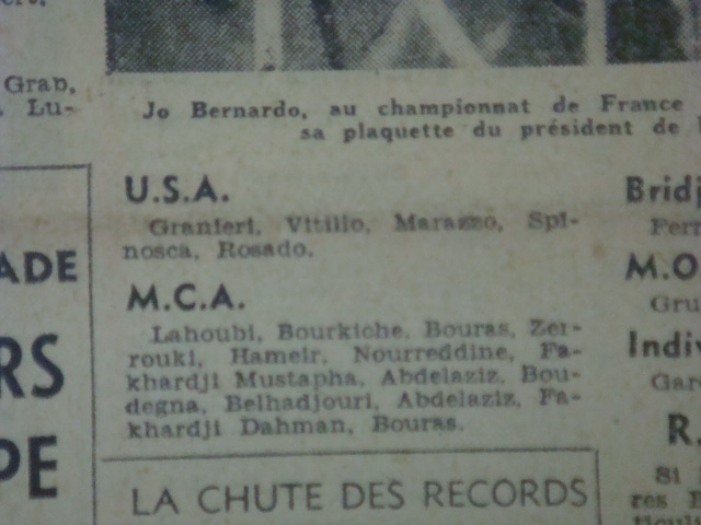 MCA Boxe Mixture de Jeunes et de chevronnés avec Omari Mohamed, Akkouche Mouloud, David Amar, Fodil Hamid, Mihri Abderrahmane, Nahi Boudjemaâ, Benhocine, Dib Hassen "Ahcène" (Frère de Dib Amar autre boxeur du MCA), Goumeri, Bouadou Amar, Bouarbi, Grandi Mahmoud Mohamed ...Benmeradi Khaled, Djellib Abdelkader, Oukali Mhena, Vasier, Koriche, Ramani Arezki, Bag Rachid, Embarek