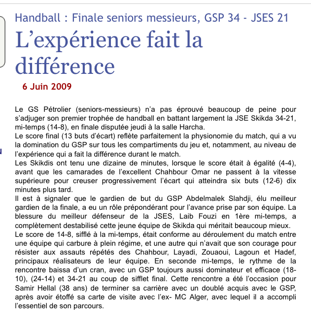 (le 28.5.2009 Finale des Juniors GSP (MCA)-MAJD Blida 40-40 Après prolongations, GSP (ex MCA) aux Tirs au But 3-2)