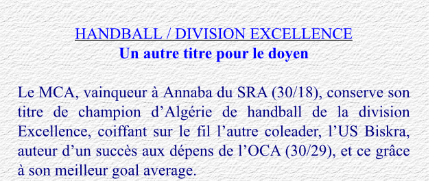 2007-2008 : MC Alger (le Samedi 21.6.2008 à La Salle "Harcha" Finale MCA-DRB Baraki (Champion de la D2) 22-18