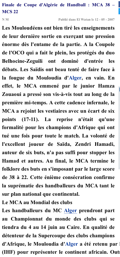27.5.2005 1/2 Finale MCA-JS Kabylie 39-26 incorporation du jeune Chehbour Riad et du junior Zouaoui Hamza)