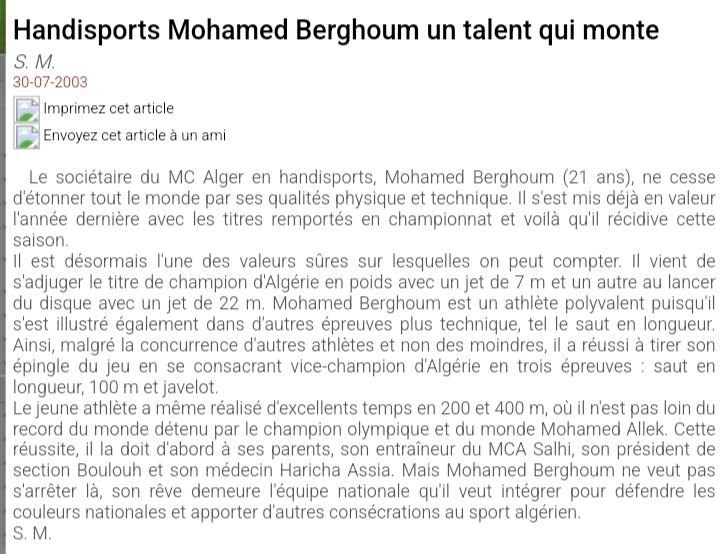 - chez les Messieurs Berrahal Mohamed (T51) 1er sur 100m (19''61 Record d'Algérie), 200m (40''08 Record d'Algérie) et au Poids (13,26m Record d'Algérie), Baka Abdellatif (T12) 1er au 800m (1'49''00 Record d'Algérie)