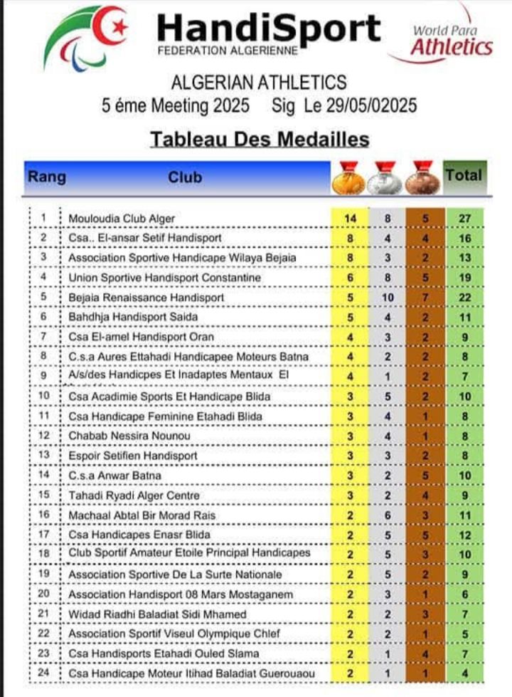 29.5.2025 le MCA 1er au 5ème Meeting de Sig avec 14 Or 8 Argent 5 Bronze